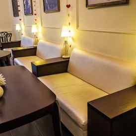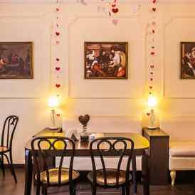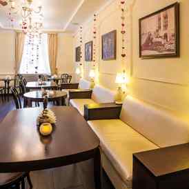 Интерьер кафе «Нарды» оформлен в классическом стиле. Бежево-коричневая цветовая палитра создает уютную атмосферу, способствующую комфортному отдыху и приятному общению. А яркие акценты, например, кофейные деревца и картины, запечатлевшие моменты из игр в нарды, добавляют заведению индивидуальность и особое настроение.